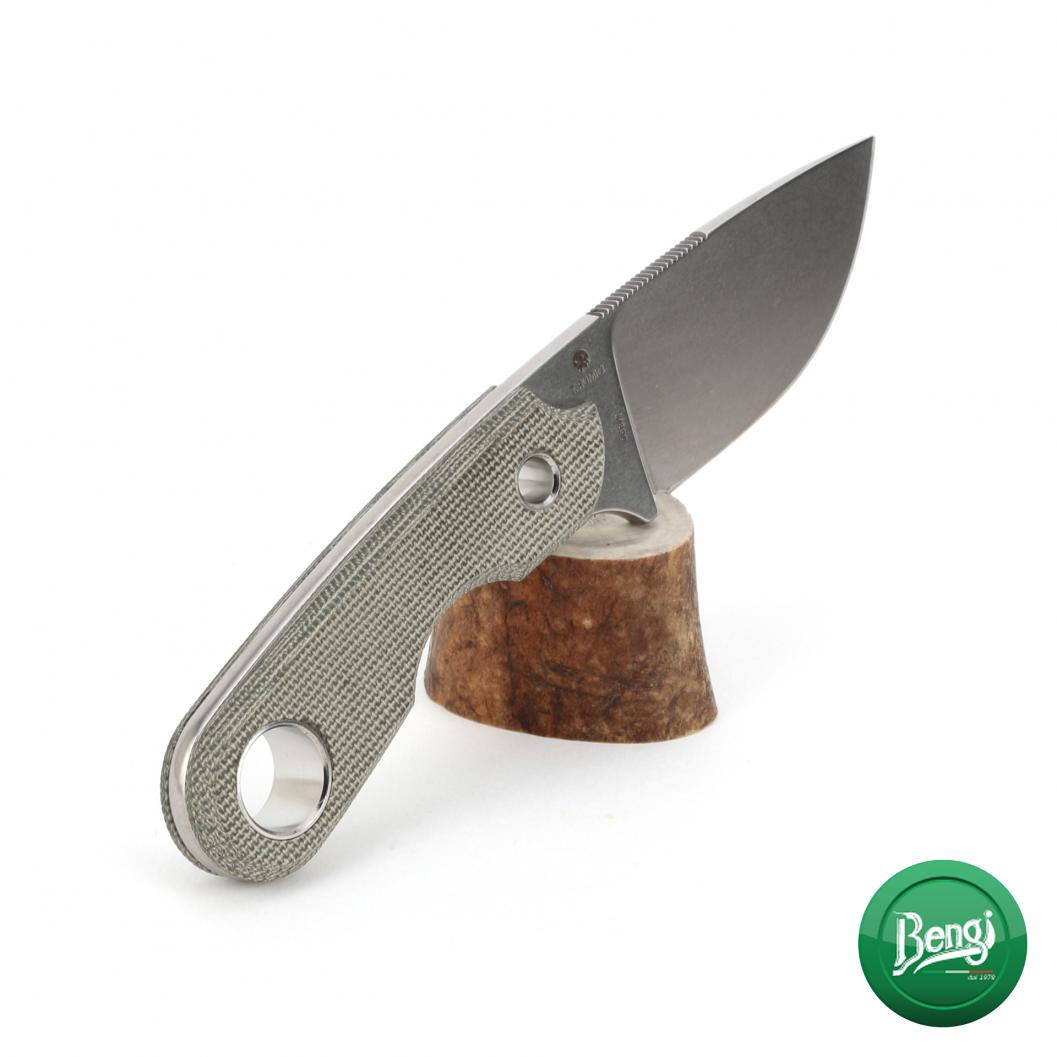 Il manico è realizzato in micarta. Questo è un materiale composto da canvas e resina sintetica. Incredibilmente forte e comodo da tenere in mano. Le grandi graffette cave che tengono insieme le guancette permettono di aggiungere un lanyard in paracord.
